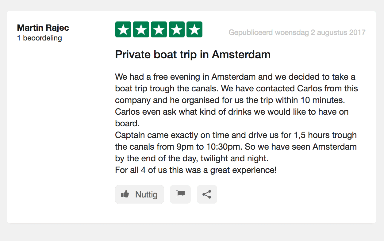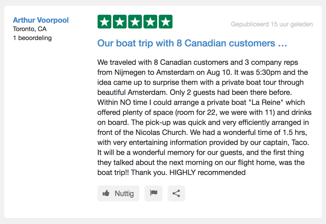 Geheel naar wens kan er vooraf bepaald worden of er meerdere opstapplaatsen zijn en langs welke bezienswaardigheden van Amsterdam er wordt gevaren. Oftewel; een unieke rondvaart over de Amsterdamse grachten geheel ingericht naar eigen inzicht en smaak. De sloep biedt een rustpuntje in ieders hectiek van het dagelijkse leven en creëert een perfect moment van ontspanning of juiste ambiance voor uw zakelijke bijeenkomsten.