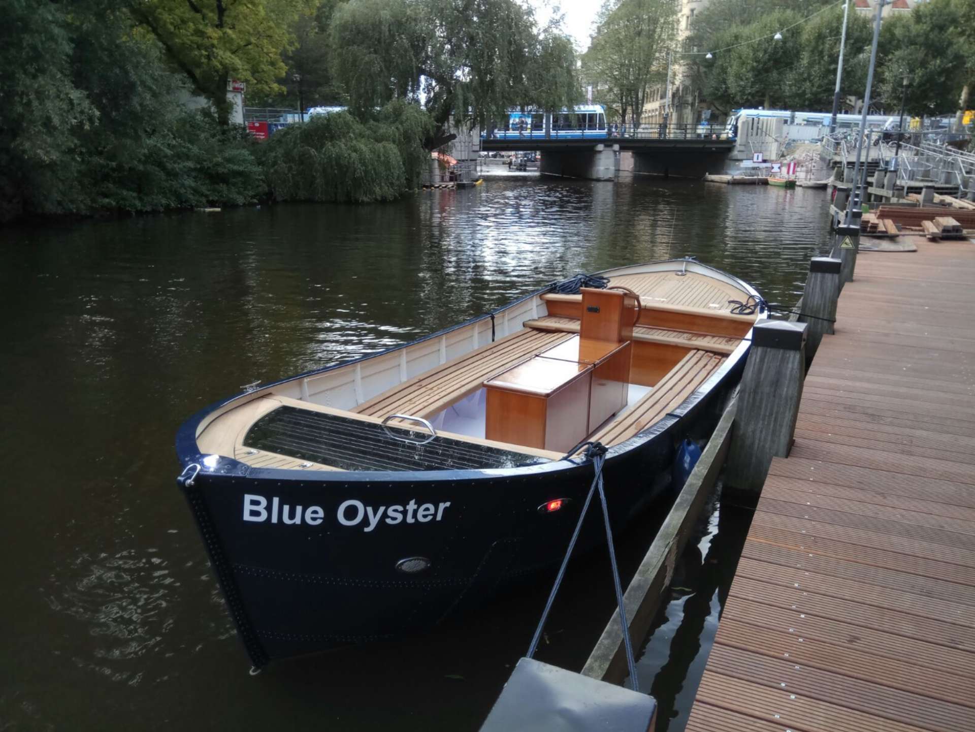 De sloep Blue Oyster, Oorspronkelijk gebouwd door het Noorse bij Fjellstrand in 1963. Eind jaren ’70 in Rotterdam verbouwd tot zeilsloep en uiteindelijk in de bossen bij Hilversum beland en verwaarloosd. Volledig gerenoveerd en ingetimmerd met een overdaad aan teak. Comfortabele bankjes, ruimte voor catering, een display voor eventuele producten.Er kunnen maximaal 12 passagiers op met naast de schipper een extra crewlid.